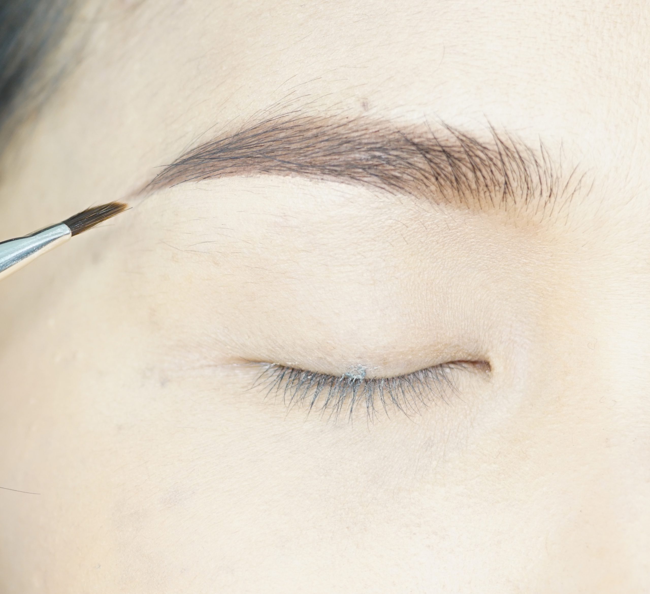 2 เอาสีฝุ่นเขียนคิ้วทาลงไปในกรอบคิ้ว โดยเริ่มจากสีอ่อนที่หัวคิ้ว และสีเข้มทาหางคิ้ว วันนี้ไม่เน้นคิ้วเข้ม วันนี้เราจะเน้นความละมุน