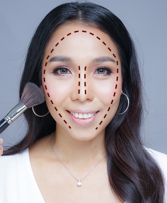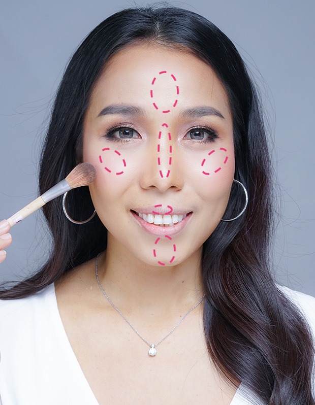 9 ใช้แปรงปัดไฮไลท์ตามตำแหน่งดังภาพเพื่อให้ใบหน้าดูโดดเด่นมากขึ้น