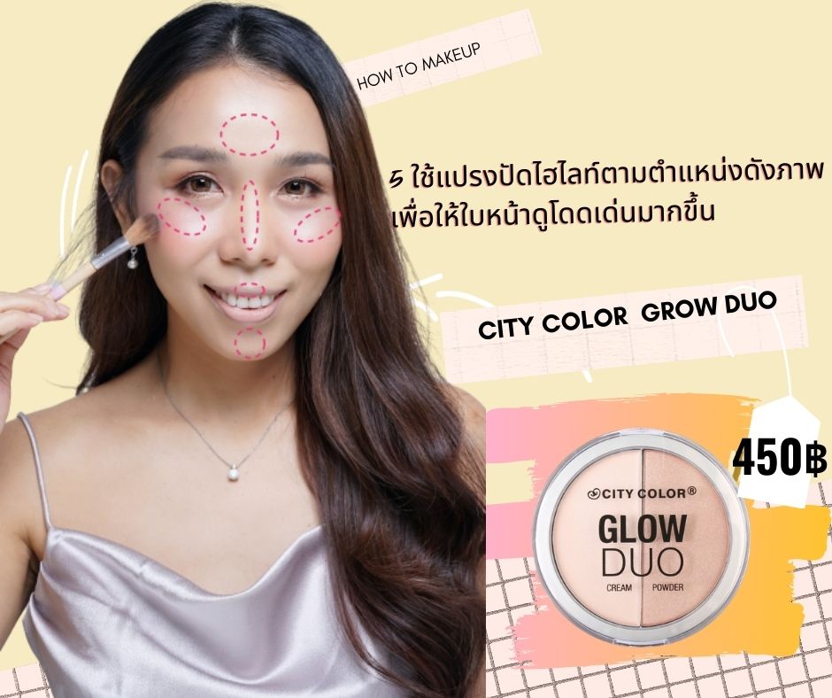 9 ใช้แปรงปัดไฮไลท์ 5 จุด หน้าผาก โหนกแก้ม ทั้ง 2 ข้าง ปลายคาง และจมูก เพิ่มจุดรับแสง ให้ใบหน้าดูโดดเด่น