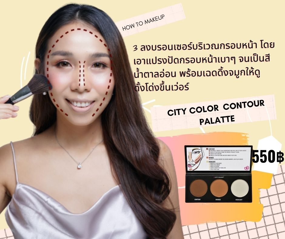 7 ลงบรอนเซอร์บริเวณกรอบหน้า โดยเอาแปรงปัดกรอบหน้าเบาๆ จนเป็นสีน้ำตาลอ่อน พร้อมเฉดดิ้งจมูกให้ดูดั้งโด่งขึ้นเว่อร์ ๆ