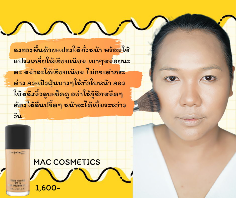 1 ลงรองพื้นด้วยแปรงให้ทั่วหน้า พร้อมใช้แปรงเกลี่ยให้เรียบเนียน เบาๆหน่อยนะคะ หน้าจะได้เรียบเนียน ไม่กระดำกระด่าง ลงแป้งฝุ่นบางๆให้ทั่วใบหน้า ลองใช้หลังนิ้วลูบเช็คดู อย่าให้รู้สึกหนืดๆ ต้องให้ลื่นปรื้ดๆ หน้าจะได้เยิ้มระหว่างวัน