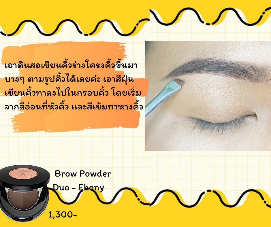 2 เอาดินสอเขียนคิ้วร่างโครงคิ้วขึ้นมาบางๆ ตามรูปคิ้วได้เลยค่ะ เอาสีฝุ่นเขียนคิ้วทาลงไปในกรอบคิ้ว โดยเริ่มจากสีอ่อนที่หัวคิ้ว และสีเข้มทาหางคิ้ว